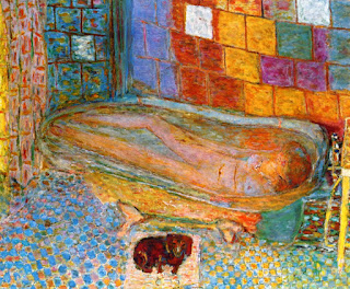 In Nude in the Bath, with Dog, begun in 1941, a year before Marthe’s death and not completed until 1946, left end, and beneath the bath on that side, in the same force-field, the floor is pulled out of alignment too, and seems on the point of pouring away into the corner, not like she lies there, pink and mauve and gold, a goddess of the floating world, attenuated, ageless, as much dead as alive, beside her on the tiles her little brown dog, her familiar, a dachshund, I think, curled watchful on its mat or what may be a square of flaking sunlight falling from an unseen window. The narrow room that is her refuge vibrates around her, throbbing in its colours. Her feet, the left one tensed at the end of its impossibly long leg, seem to have pushed the bath out of shape and made it bulge at the a floor at all but a moving pool of dappled water. All moves here, moves in stillness, in aqueous silence. One hears a drip, a ripple a fluttering sigh. A rust-red patch in the water beside the bather’s right shoulder might be rust or old blood, even.